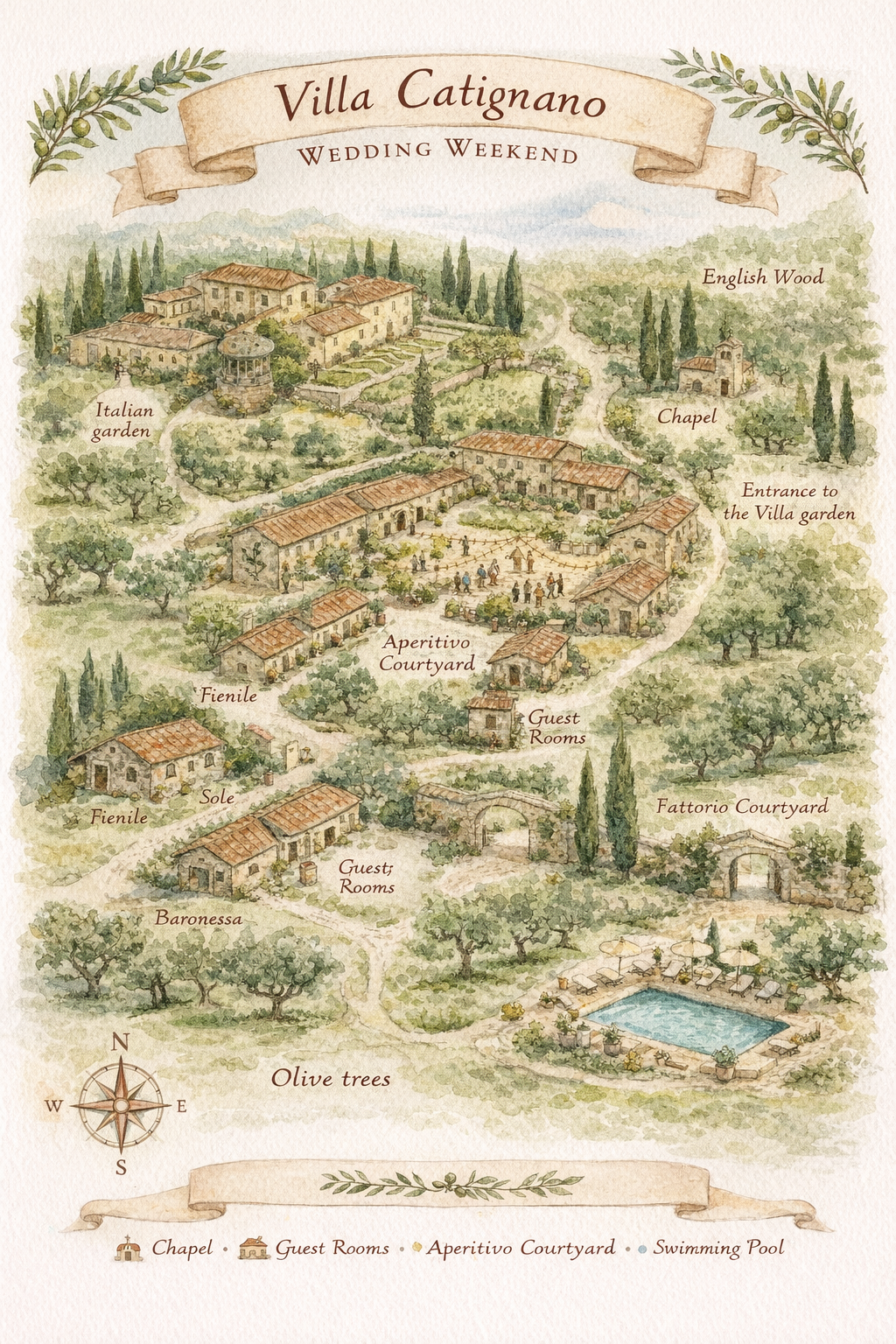 A bespoke illustrated timeline of your wedding celebrations, from welcome drinks to farewell brunch, created in your chosen aesthetic.